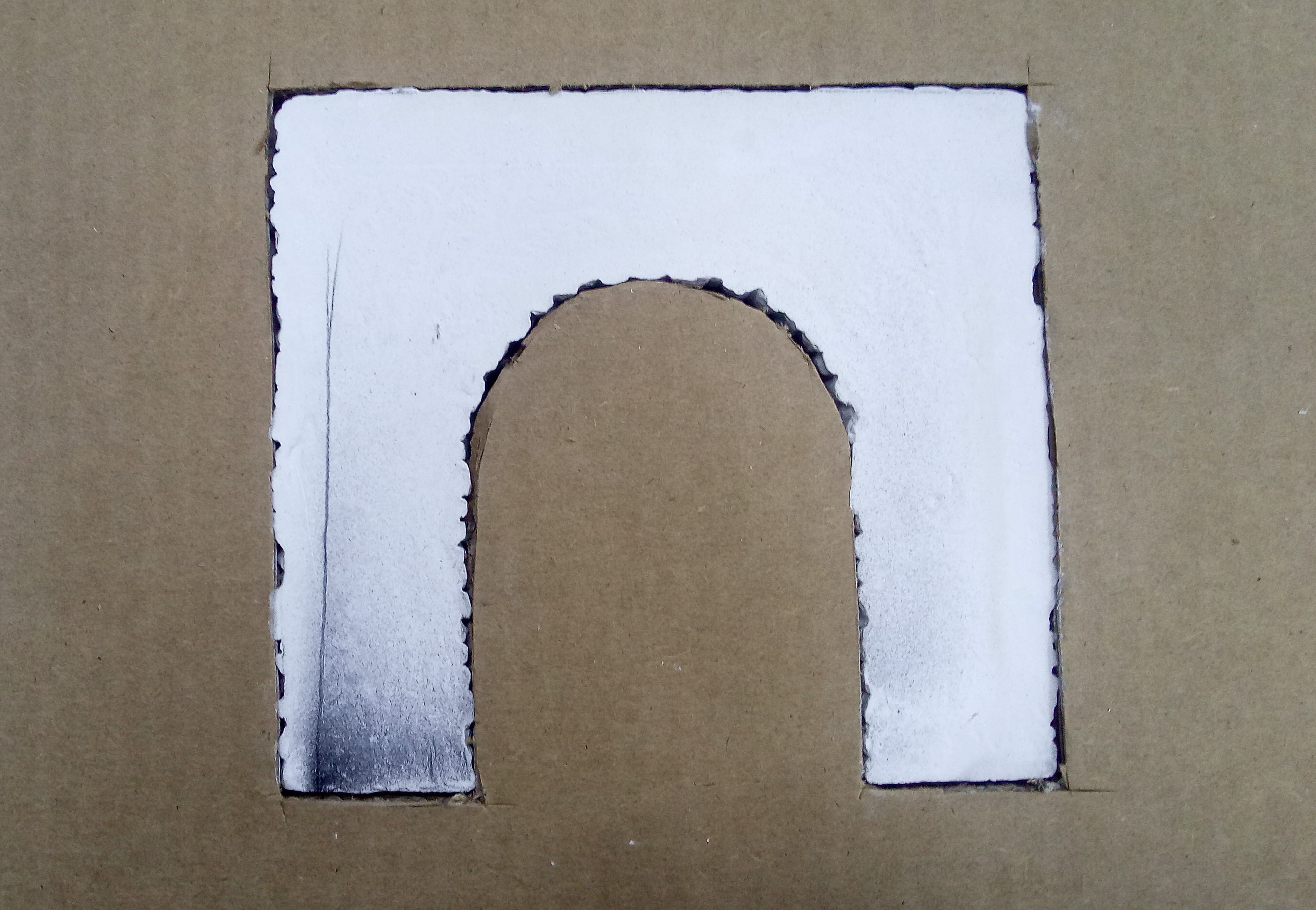 Making a cardboard mask to keep the black paint off the face. Insert the tunnel mouth from the rear so that it sits a bit through