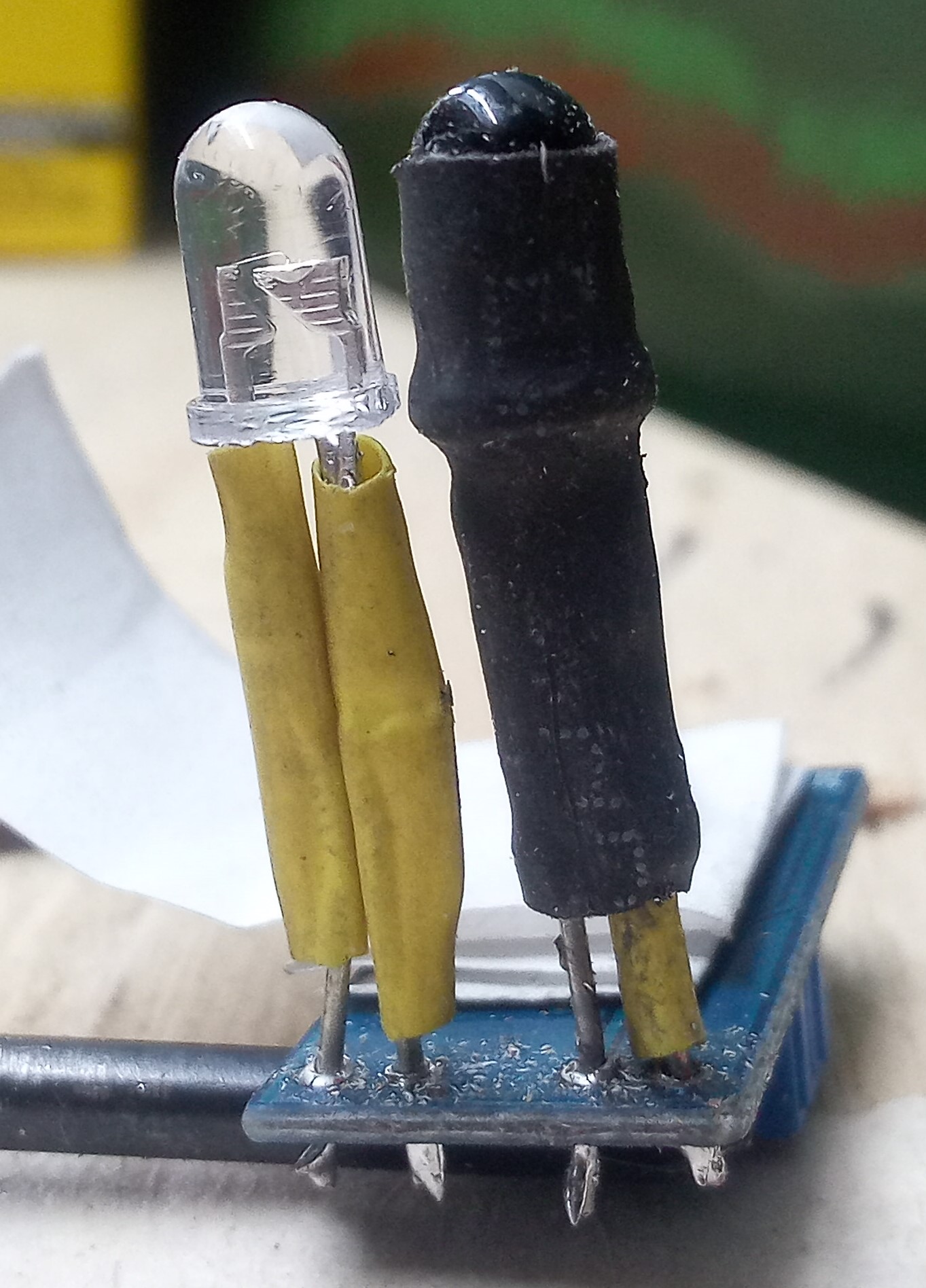 This is a cheap line follower detector as used in line following robots, to get the detector to operate through the track base I had to modify it by extending the LEDs to the thickness of the track bed.